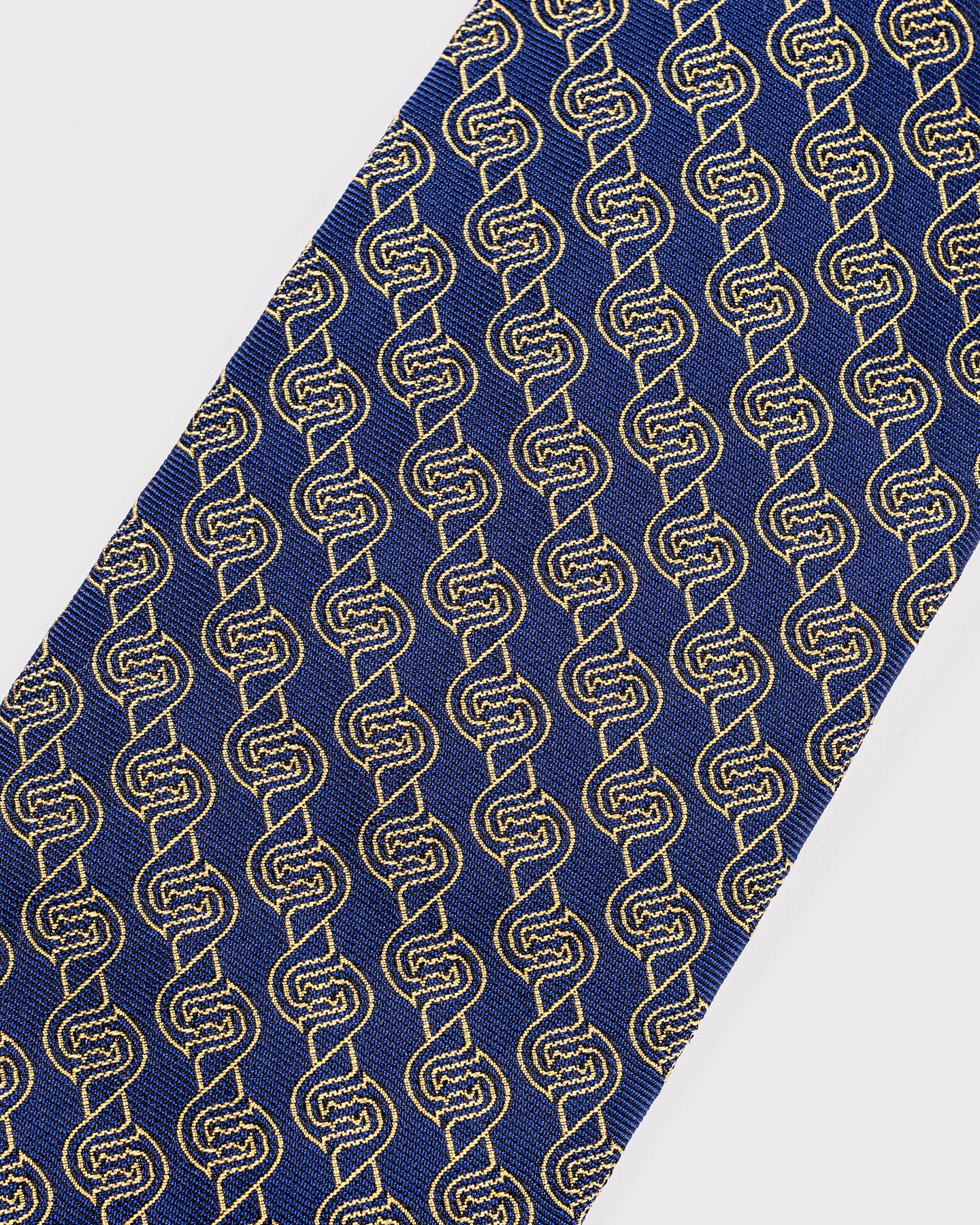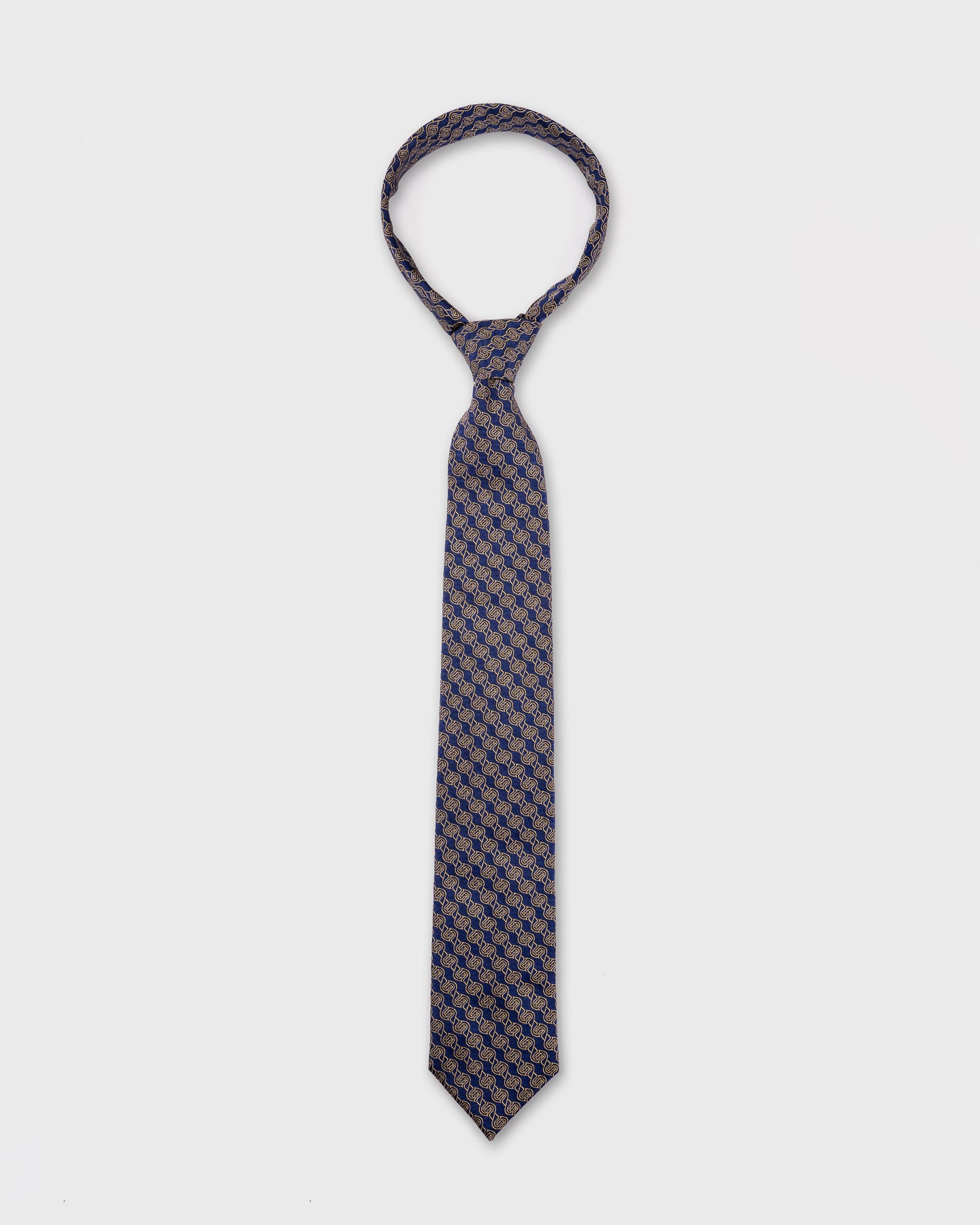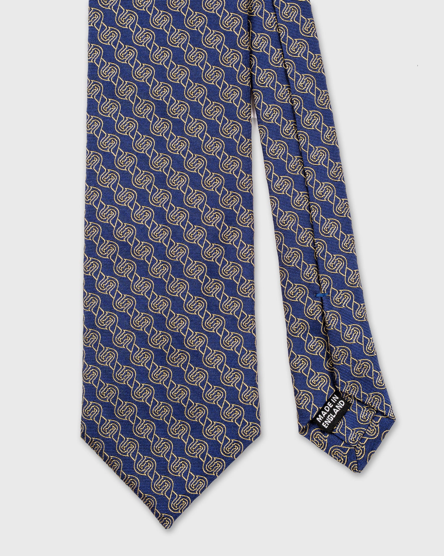 A sophisticated blend of colour and craftsmanship, this silk tie is woven in England by the esteemed Stephen Walters mill. Featuring a royal blue ground enlivened by an intricate interlocking motif in gold and ivory, it strikes a confident balance between boldness and tradition.