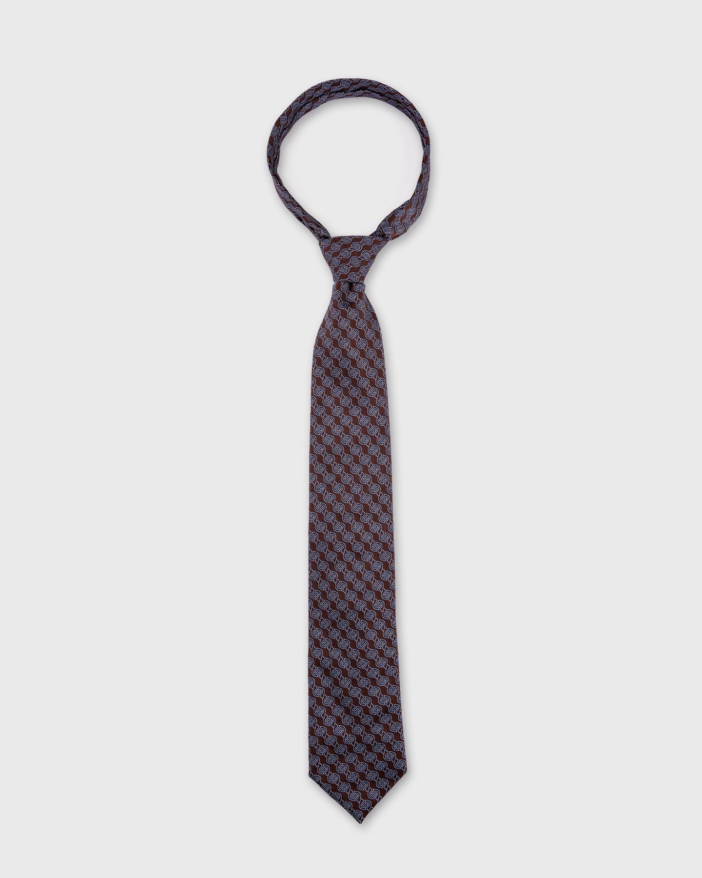 Expertly woven in England by the esteemed silk weavers Stephen Walters, this distinguished tie exemplifies traditional craftsmanship and understated elegance. Rendered in a rich chocolate brown, the design features a repeating interlocking motif in soft sky blue and white, offering a contemporary nod to classic geometric patterning.