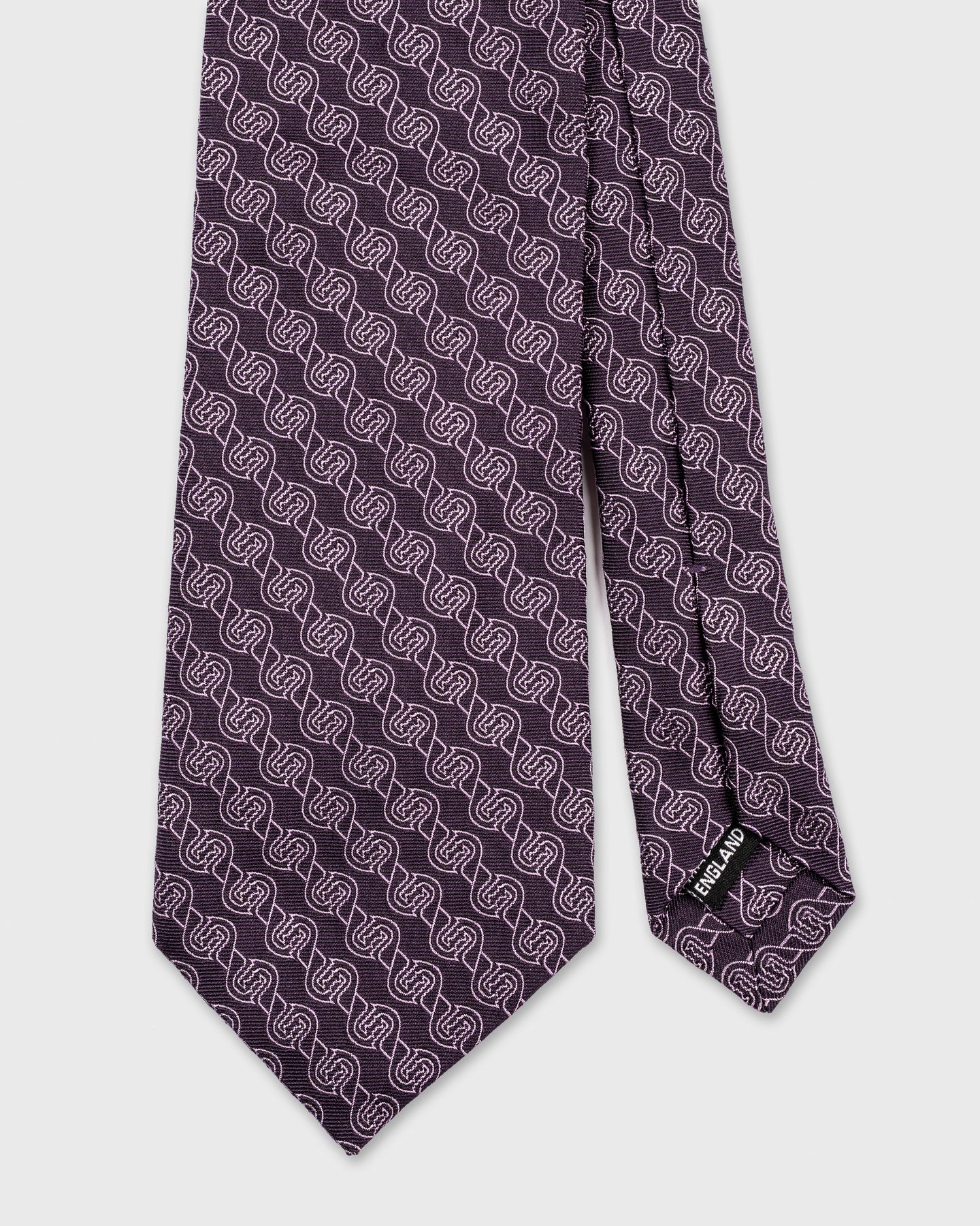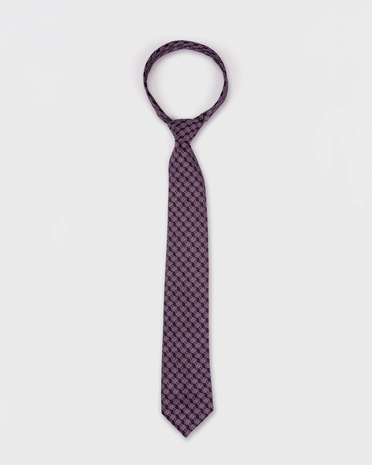 Rich and refined, this silk tie is expertly woven in England by Stephen Walters, one of the country’s most distinguished silk weavers. The deep aubergine ground is elegantly offset by a continuous interlocking motif in soft lilac, offering a sophisticated balance of colour and texture.