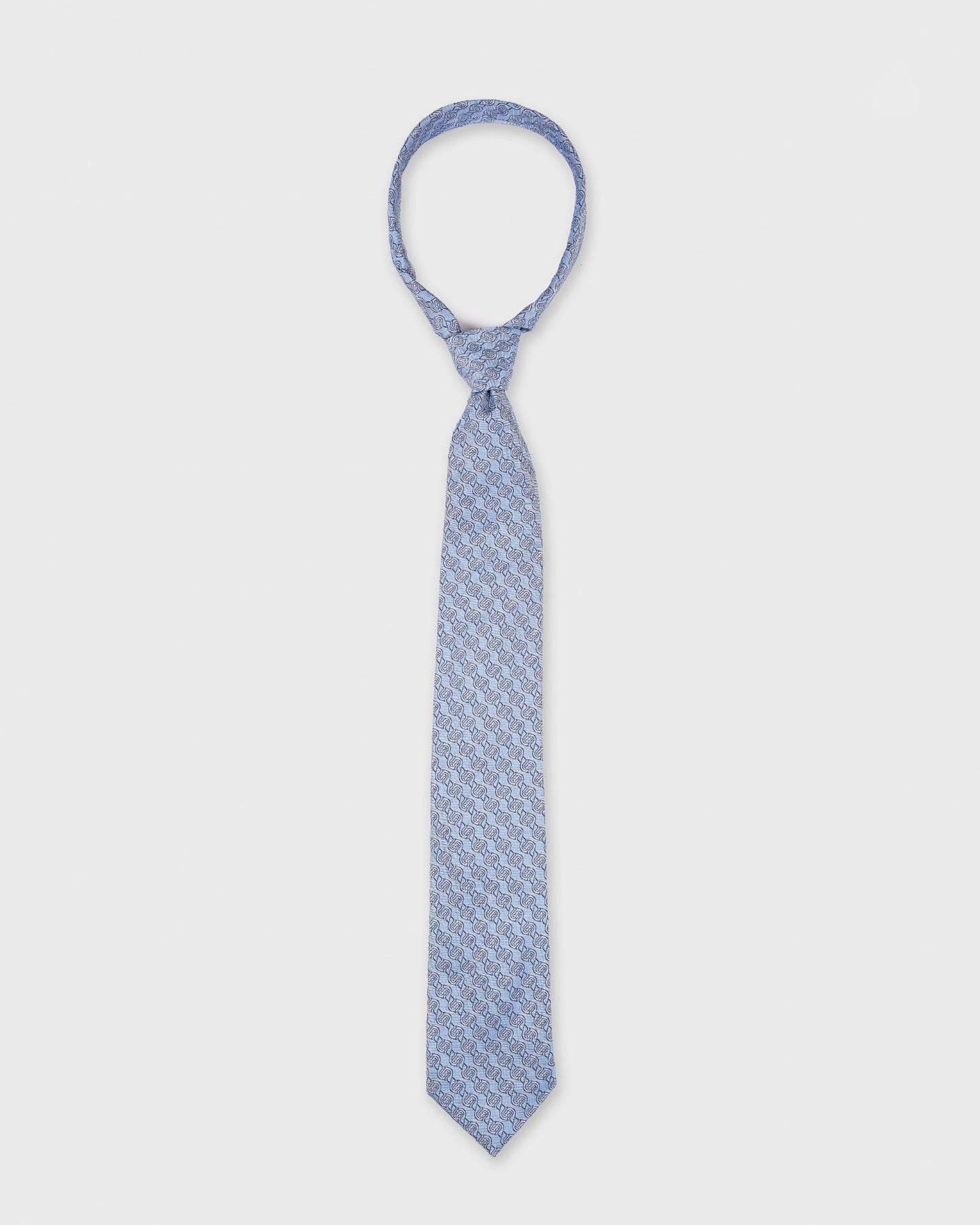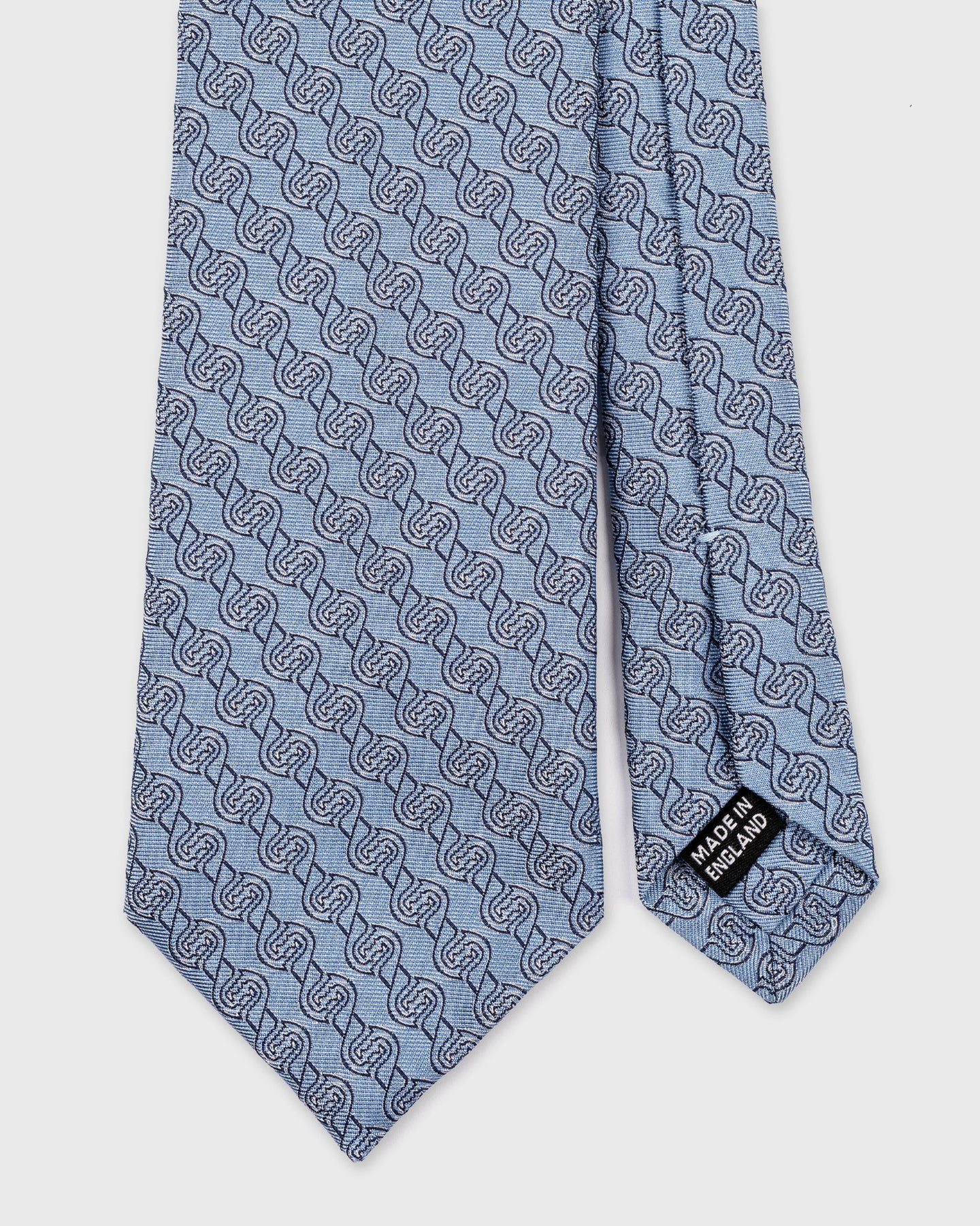 Woven in England by the master weavers at Stephen Walters, this elegant tie is a celebration of British silk craftsmanship. Set against a pale blue ground, the repeating interlock motif in navy brings depth and rhythm to the design while maintaining a refined, contemporary sensibility.